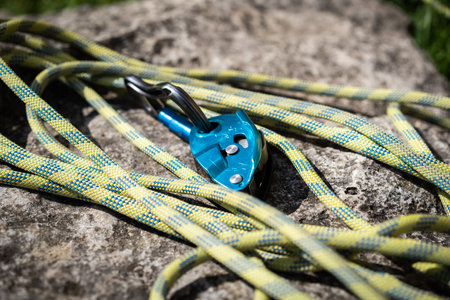 Rock climbing gear with carabiners and rope on rocky surface. Concept of outdoor adventure, mountaineering, safety equipment, extreme sport.