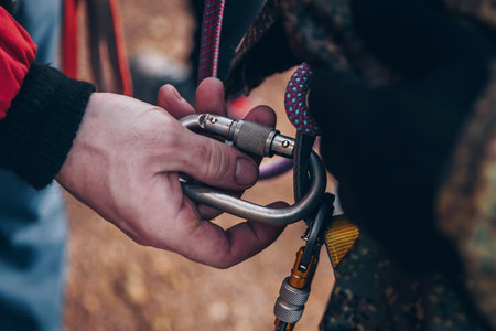 Close-up of climber hands holding safety harness and climbing equipment