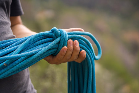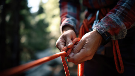 Close-up of outdoor adventure with hands tying climbing rope during hike.