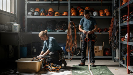 People carefully washing and checking safety harnesses and climbing gear stored in a large, deep ind