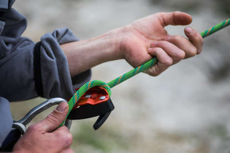 Close up shot of a man's hands operating a rock climbing belaying device.