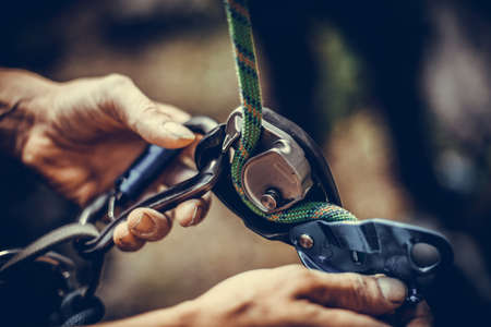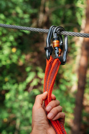 Rope park. The hand hooks the carabiners to the belay line. Close-up