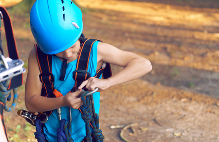 Teen girl ties a safety rope before climbing the rock wall. Close-up image. Active lifestyle concept