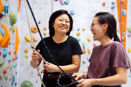 Smiling Asian women in sportswear posing near the bouldering training wall. Mother and daughter on the climbing wall. A cute Korean girl and her parent are working out at the gym.