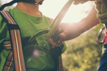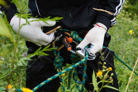 A rock climber tie a knot on a rope. A person is preparing for the ascent. The child learns to tie a knot. Checking the insurance for climbing.