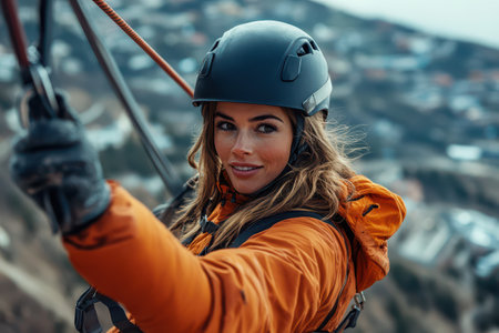 An AI generated illustration of A Asian female in her twenties is seen ascending a rope while wearing a climbing helmet in preparation for a climb