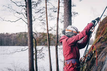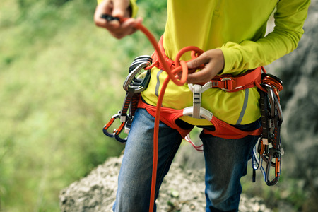 Rock climber checks insurance before use