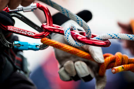 Carabiner and loop of climbing rope. Equipment for climbing and mountaineering.