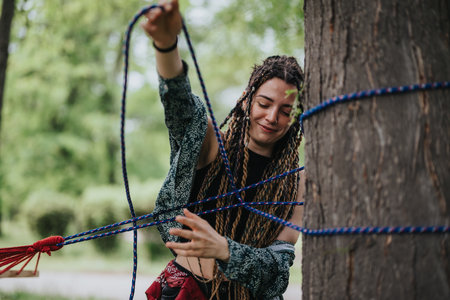 Young woman setting up rope in nature with focus on outdoor activity