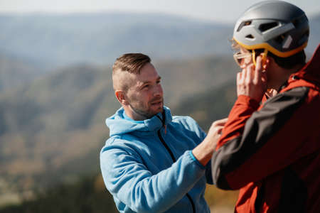 Young climbers alpinist prepare to rock-climbing on mountain peak