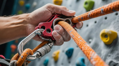 Close up shot of a man's hands operating a rock climbing assisted belaying device.
