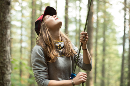 Young female climber holding climbing rope in forest, Mount Hood National Forest, Oregon, USA