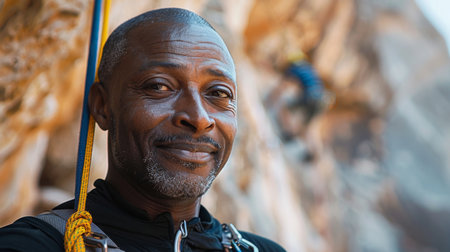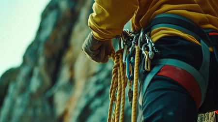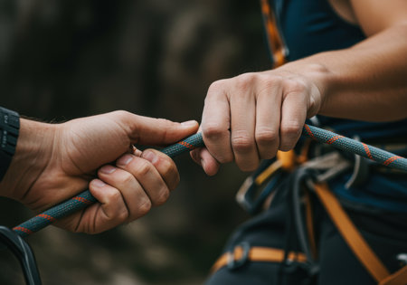Close up of two climbers gripping a rope, teamwork and trust during an outdoor adventure, wearing safety harnesses.