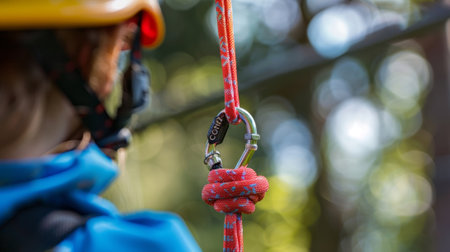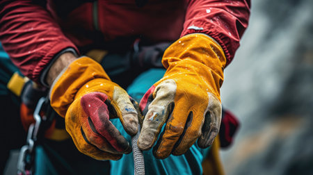 In the golden light of early morning, a skilled professionals gloved hands expertly tie a secure knot. This close-up shot captures a moment of intense focus and preparation, symbolizing safety, reliability, and readiness for the challenge ahead.