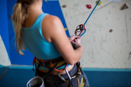 Close-up of sporty climber woman in safety harness belaying with rope and figure eight indoor.