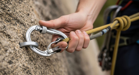 Man's hand holding a climbing carabiner attached to a rope on a rock. Sport safety equipment. Rock climber.