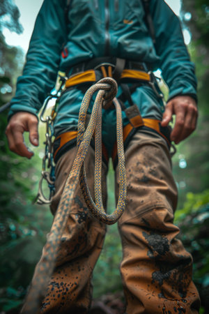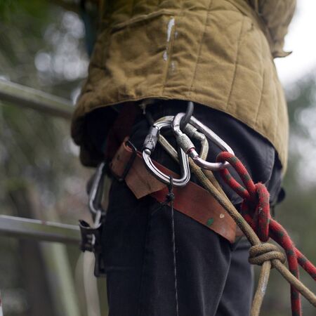 close-up of a climber with climbing treeup equipment on the belt