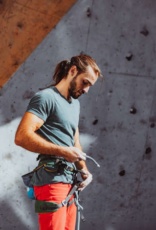 Young sportive man, rock climber holding rope, ready for training on the artificial climbing wall. Concept of sport life and climbing
