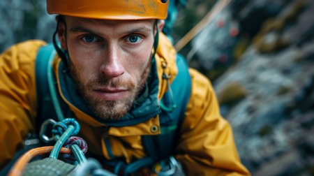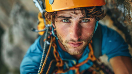 Climber Ascending Rocky Terrain in Mountainous Region During Daylight With Focused Expression on Their Face. Generative AI