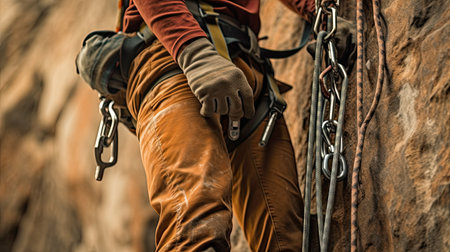 Close-up of climber hands holding safety harness and climbing equipment