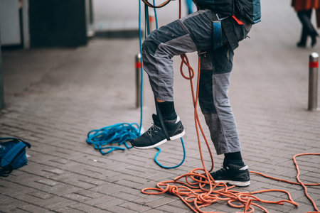 Worker climber preparing for work at height.
