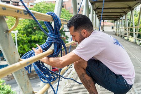 Salvador, Bahia, Brazil - October 24, 2021: Rappelist arranging abseiling equipment to go down the walkway. City of Salvador capital of Bahia, Brazil.