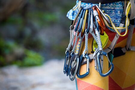 Climbing equipment on a male climber: rock shoes, rope, quickdraw, safety device, harness. Sports mountain tourism, active lifestyle, extreme sports