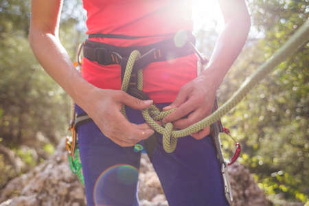 Climber tying knot in climbing rope for safety