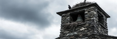 Stone Bell Tower Bird Nest Cloudy Sky Dramatic Architecture old grey dark view rock wall roof rural