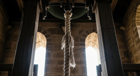 Rope tied around the bell of a church, close up.