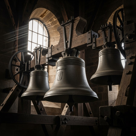 Inside a historic bell tower, large bronze bells hang from wooden rafters. Sunlight filters through arched windows, illuminating the rustic wooden floor and staircase.