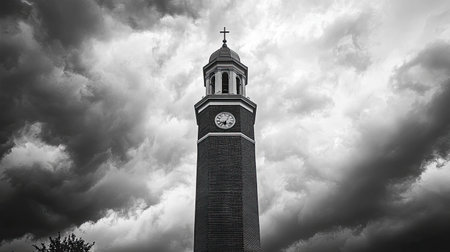 A striking black and white image of a clock tower beneath a dark, ominous sky, showcasing architectural beauty, drama, and a sense of time passing.