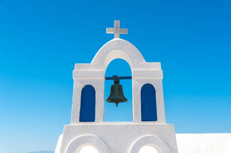 Traditional bell tower of the churches in Santorini Island against a deep blue sky