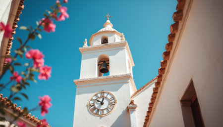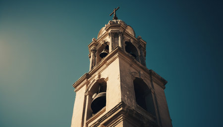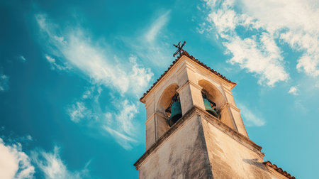 A stunning view of a historic church tower featuring a bell and a cross, set against a clear blue sky with fluffy clouds. Perfect for travel and architecture themes.