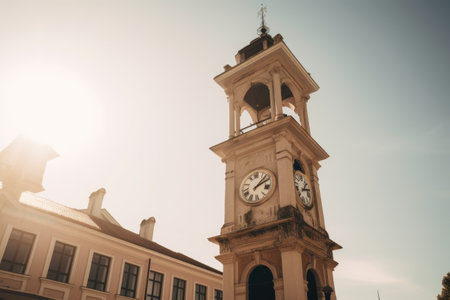High angle view of clock tower in 18th century city square, created using generative ai technology. Historical architecture, landmarks and city planning concept digitally generated image.