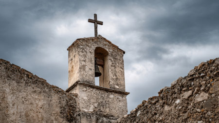 A lone cross, standing stoically in front of a dilapidated church bell tower, symbolizing the enduring power of faith amidst adversity