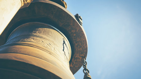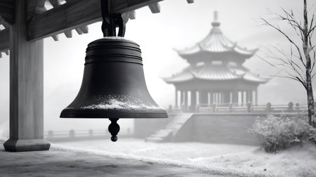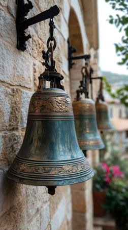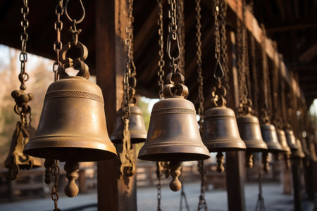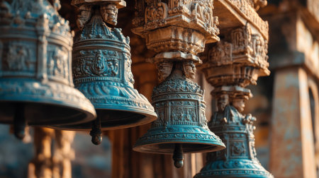 Experience the captivating beauty of ornate temple bells hanging in an ancient sanctuary, surrounded by a serene atmosphere that invites reflection and spirituality.