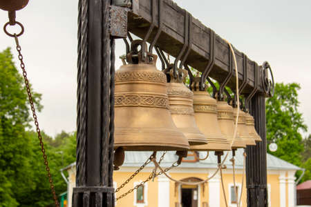 old orthodox copper church bells in the blue sky.