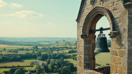 A stunning view from a bell tower showcasing expansive hills and a picturesque countryside. Ideal for travel and architectural themes in photography.