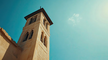 A stunning view of a historic tower reaching towards a clear blue sky, showcasing intricate designs and architectural beauty in a serene outdoor setting.