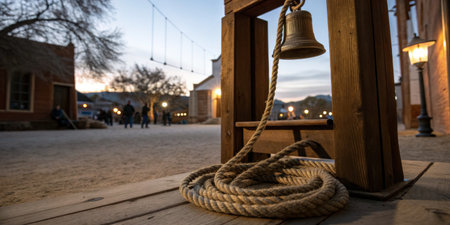 A weathered bell hangs from a rustic wooden stand as twilight sets, illuminating the streets.