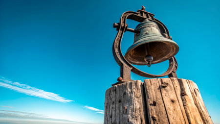 A large bronze bell rests on a weathered wooden post outdoors, set against a vibrant blue sky. The scene captures the beauty of the bell as it stands tall during golden hour, inviting admiration.