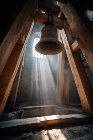 Bell hanging inside an ancient bell tower with dusty light rays entering through a window