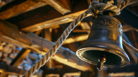 Bronze church bell being rung by a rope inside a wooden belfry. Concept of religious traditions, old architecture, bell ringing, spiritual ceremonies. Historic preservation, cultural heritage.