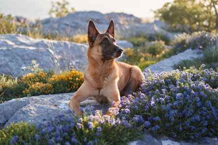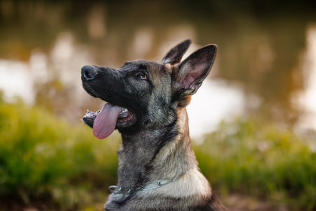 Close-up view of Belgian Shepherd Malinois. Cute dog lying on sunny summer day.