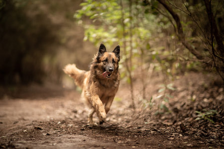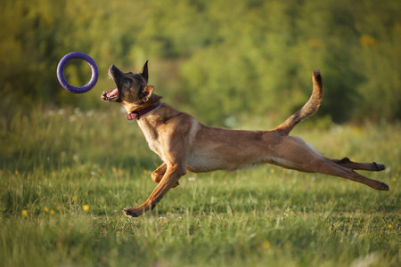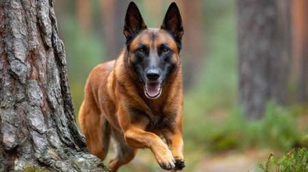 Active malinois dog enjoying a playful run outdoors, moving forward with mouth open