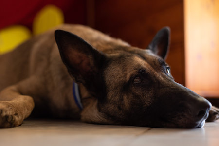 Portrait of the dog lying on the tiled floor. German shepherd.