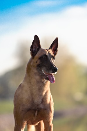 Beautiful tired belgian malinois shepherd dog with his tongue out looking at the camera.