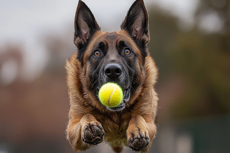 picture of a purebred belgian sheepdog malinois and ball in his mouth close up shot