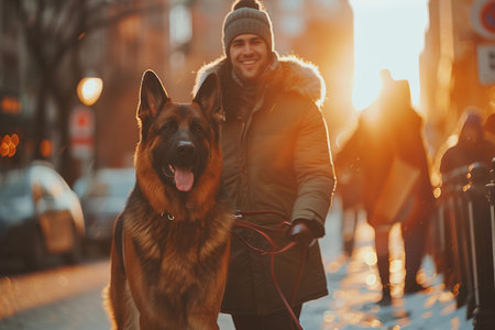 Smiling man walking his German Shepherd during a golden sunset in the city.